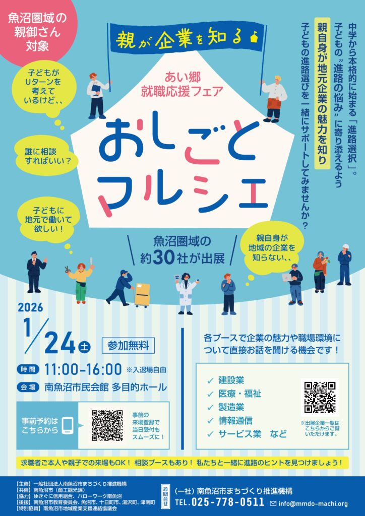 URL:【親が企業を知る】あい郷就職応援フェア「おしごとマルシェ」開催します! – 南魚沼市移住定住情報サイトSUMU SUMO・南魚沼市まちづくり推進機構